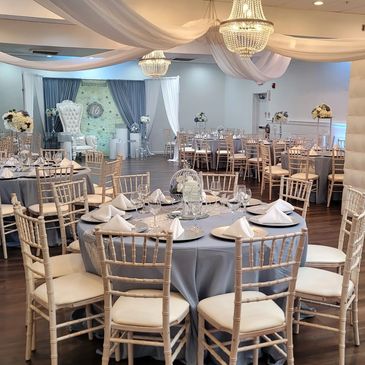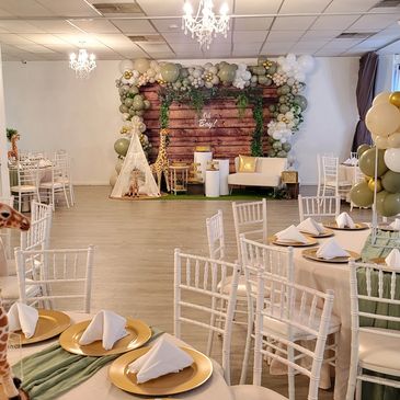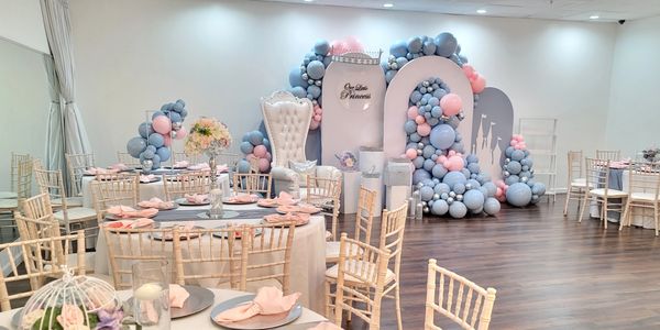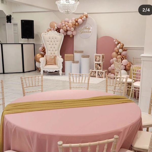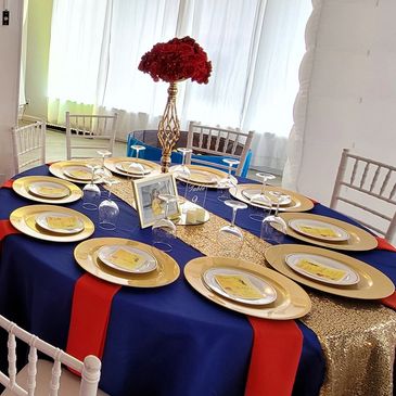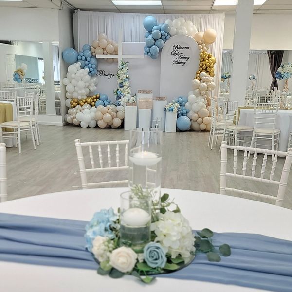 Take a look at some of our decorator's designs. Get our decoration service at Carolina Rosa Arts Academy or bring it to your location. Packages online are for 11 tables for up to 110 Guests (Text us to find out how much for additonal table set up).